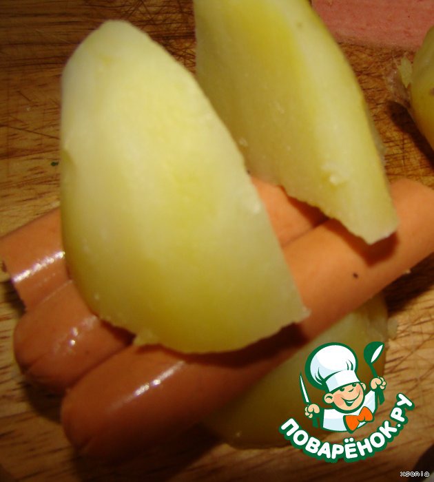 Солим перчим..Выкладываем на картофель порезаные сосиски(Или другие мясные продукты по желанию)И накрываем опять картофелем( сосиски можно немного посыпать тертым сыром..)