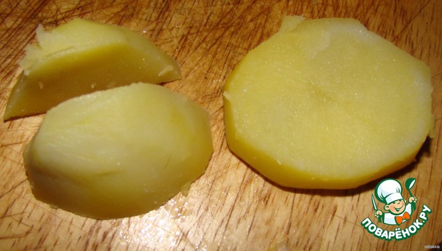 Картофель отварной очистим от кожуры...режем на две части..затем ту часть которая будет сверху ..еще на две части..