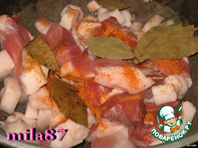 Мясо режем на крупные куски, сало также режем. Раскаливаем казан и высыпаем мясо, приправляем специями, кидаем лавровый лист и жарим, пока сало не начнет плавиться. Затем убавляем огонь и обжариваем мясо почти до готовности.