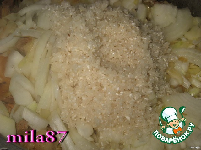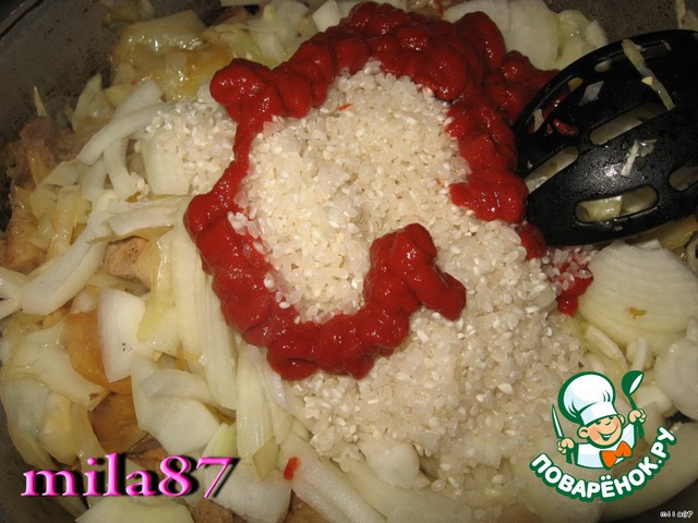 Заливаем водой, так, чтобы слегка все покрывала. Тушим до готовности риса.