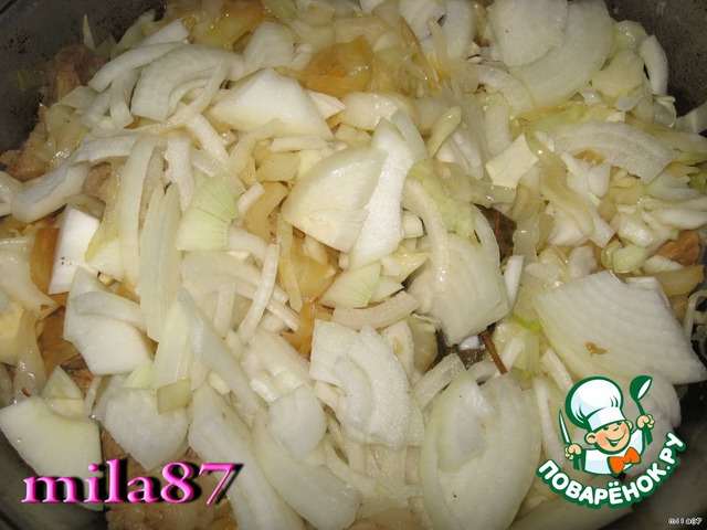 Следом кидаем лук, нарезанный полукольцами. Перемешиваем и тушим на медленном огне, около 15 минут.