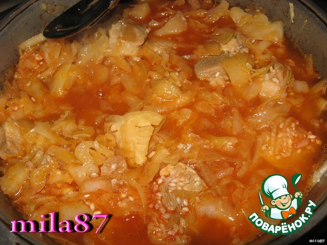 | Просмотрев на сайте все блюда болгарской кухни, не обнаружила ни одного, которые готовим мы. Решила начать знакомить Вас, мои любимые ПОВАРЯТА, с моей родной БОЛГАРИЕЙ!!! Мы, как чистокровные болгары, часто готовим это блюдо, причем готовил его всегда папа, мама, конечно, тоже иногда готовила, но у папы получается лучше, впрочем, как у всех мужчин. Вот и я решила научиться готовить это блюдо, под четким папиным контролем, как в детстве, когда папа чему-то учил меня!!! Капуста, тушенная с рисом на мясе и сале... звучит не знаю как, но на вкус БЕСПОДОБНО!!!!! |
