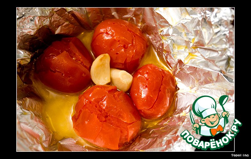 Помидорки и чеснок запекаем в фольге (я их проткнула вилкой и слегка полила "розмариновым" оливковым маслом). Помидорки очищаем от шкурки и разминаем вилкой вместе с чесноком.