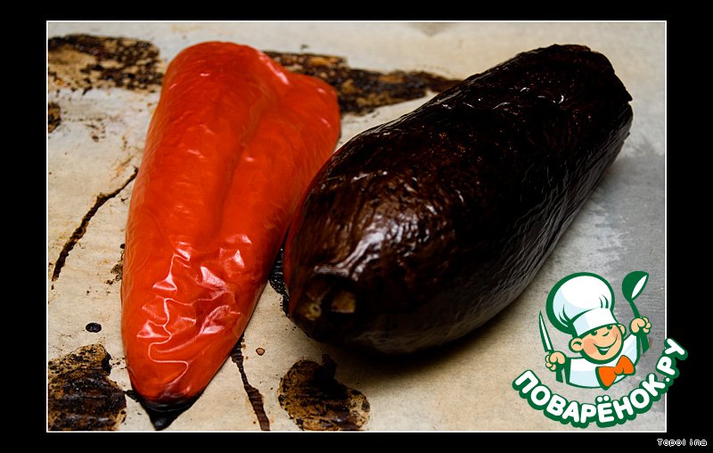 Болгарский перец, порезанный на половинки, и баклажан, наколотый вилкой, также запекаем в духовке до готовности. Чистим от шкурок и измельчаем.