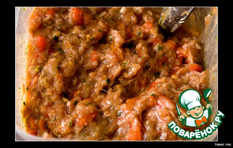 Смешиваем овощи с мясным фаршем (у меня была говядинка), петрушкой, укропом, молотым перцем, солью. Я добавила несколько капель соевого соуса (факультативно) и сок с маслом, оставшиеся в фольге от запекания помидорок.