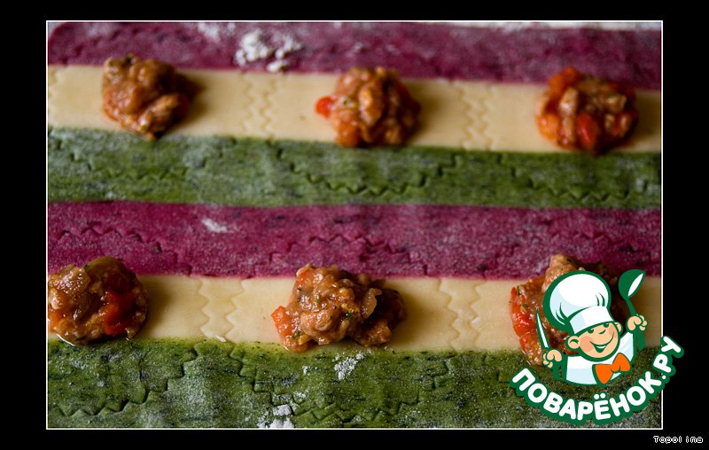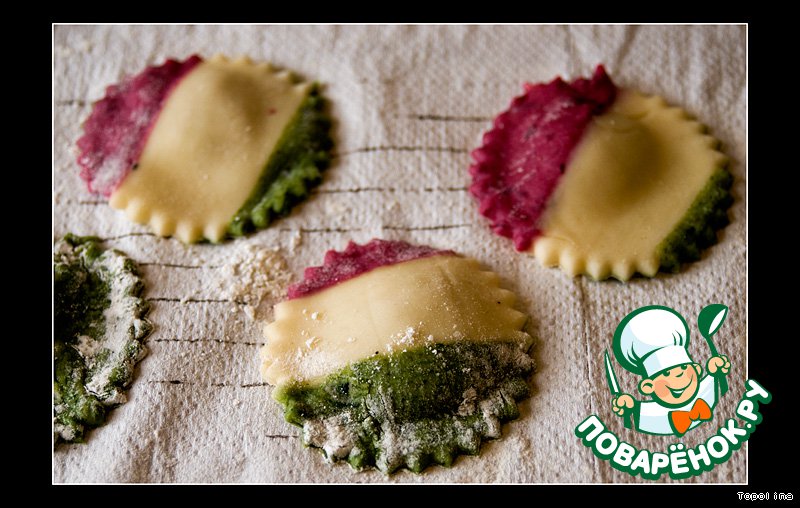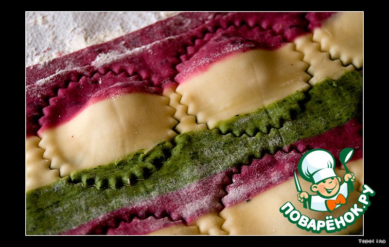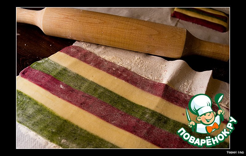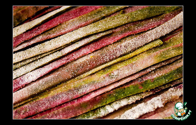| Не подумайте ничего такого, на самом деле, к Италии я дышу очень ровно, просто доступных мне природных красителей существует не так уж и много да к тому же Oxana_71 в новогоднюю ночь поставила меня перед выбором: или обрезки крашеного теста для пасты забираю я, или это тесто отправится в мусорку. Проснувшийся во мне не ко времени Плюшкин решил тесто забрать, а вечно спящему во мне Да Винчи пришлось изобретать, куда же это чeртово тесто (моя жадность меня однажды погубит) пристраивать. |