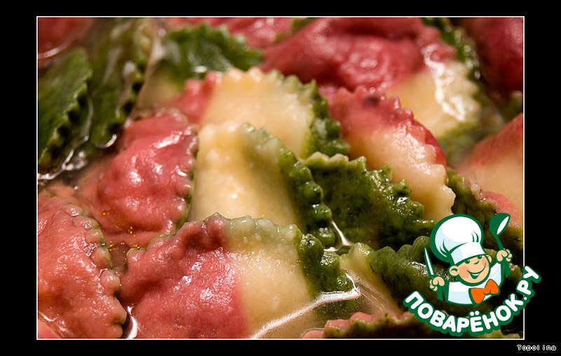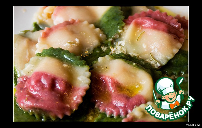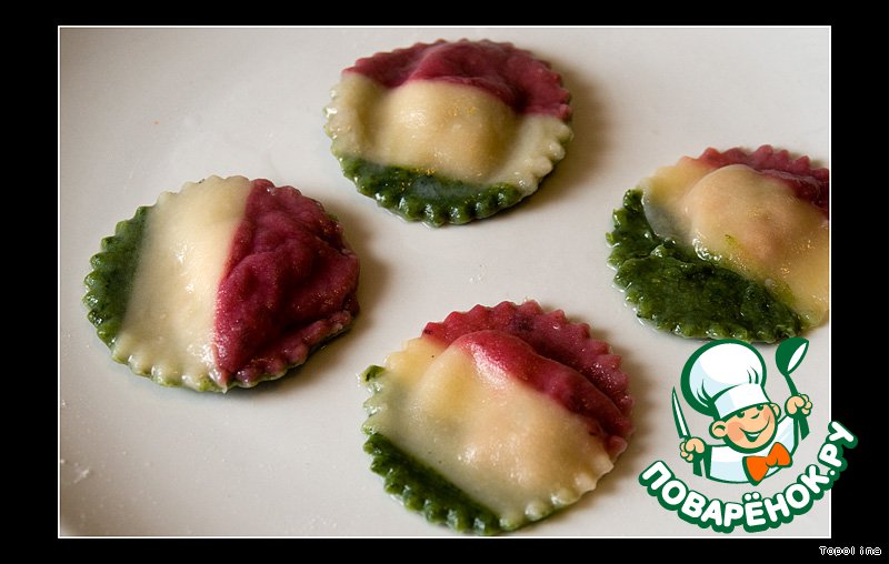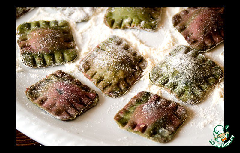 1. Использовать начинку полностью готовую (в смысле — не сырую, а варeную-жареную-пареную и т.д.), катать тесто потоньше и вынимать равиоли из воды практически сразу, как они всплывут. В этом случае цвет остаeтся относительно насыщенным, почти не выцветшим: