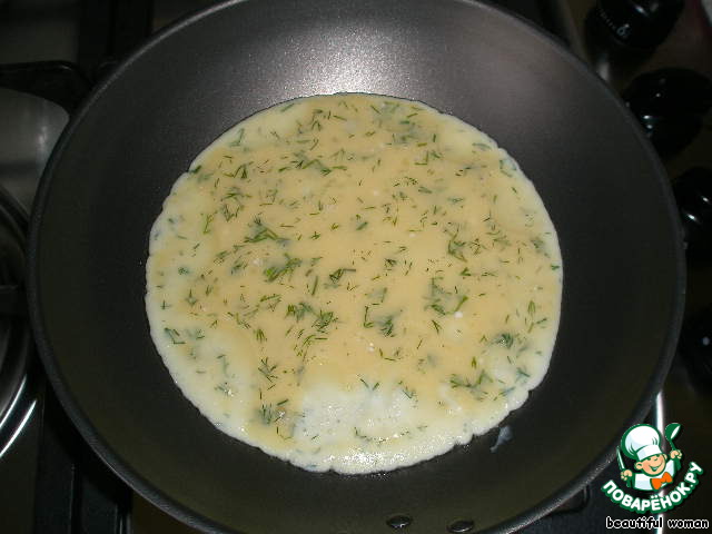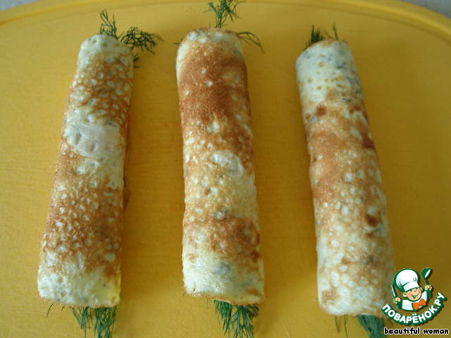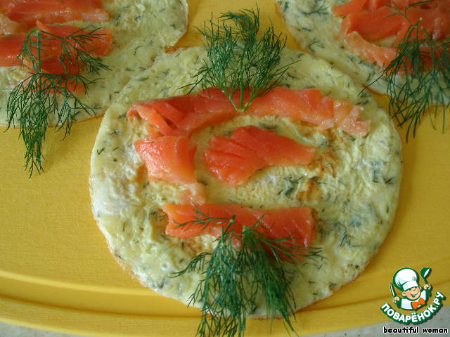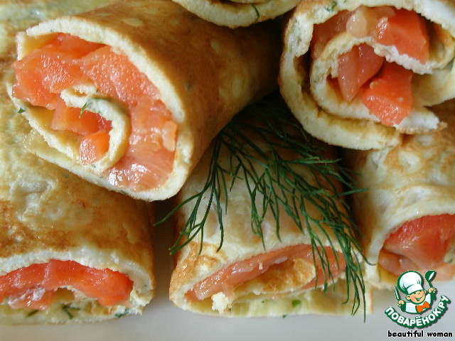 Раскладываем на омлетные блинчики ломтики рыбы и веточки