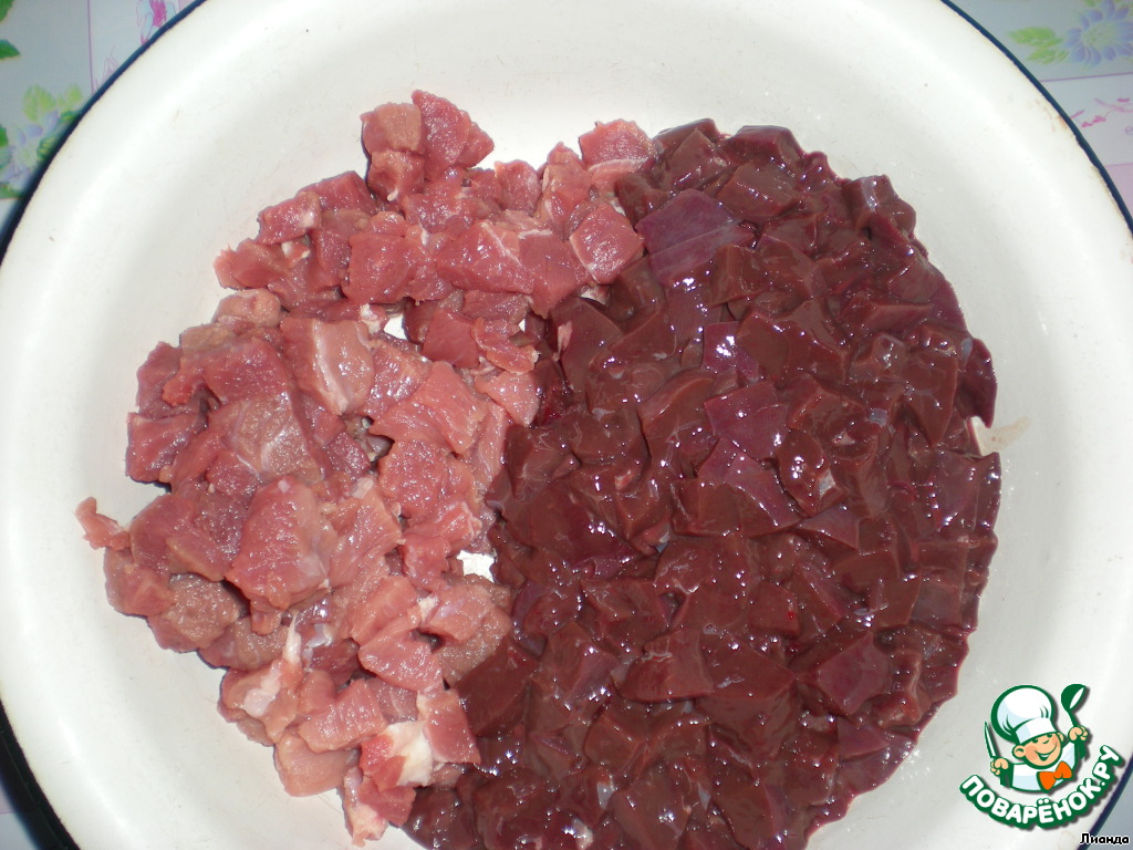 Говядину (лучше брать молодую или телятину) и печень мелко нарезать кубиками.