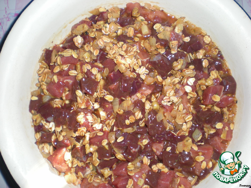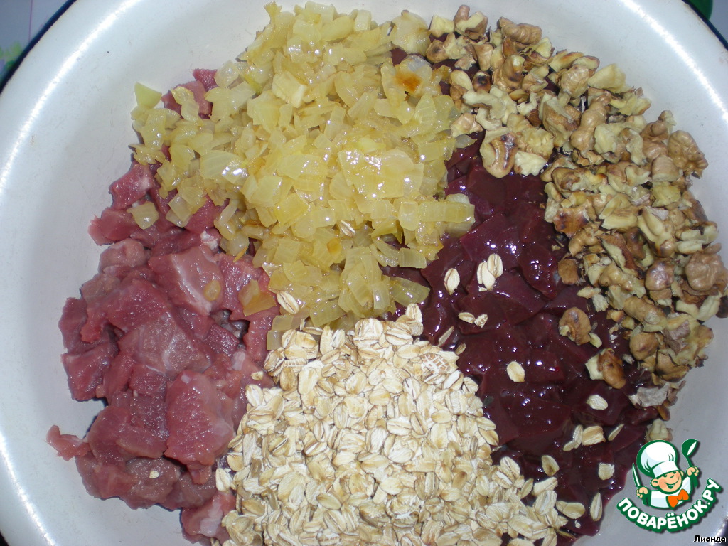 Лук мелко порезать и обжарить на сливочном масле. Добавить к печени. Туда же всыпать овсяные хлопья и поджаренные грецкие орехи.