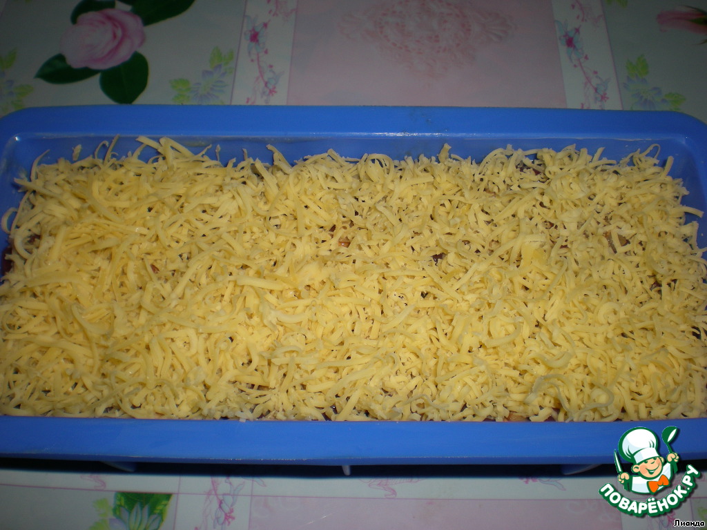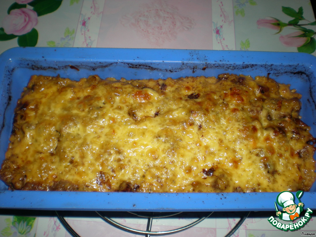 Накрыть форму фольгой и выпекать в духовке при температуре 170* час. Фольгу снять и выпекать еще 10 мин, чтобы сыр зарумянился.
