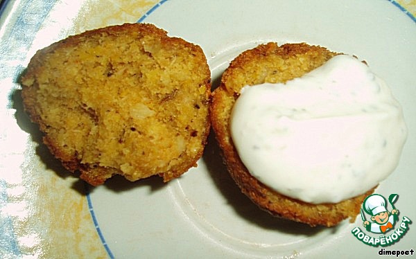 Как кожа после интенсивного загара нуждается в креме, эти гороховые пончики нуждаются в соусе. Делаем экспресс-соус из нарезанного оставшегося чеснока, сметаны, горчицы.