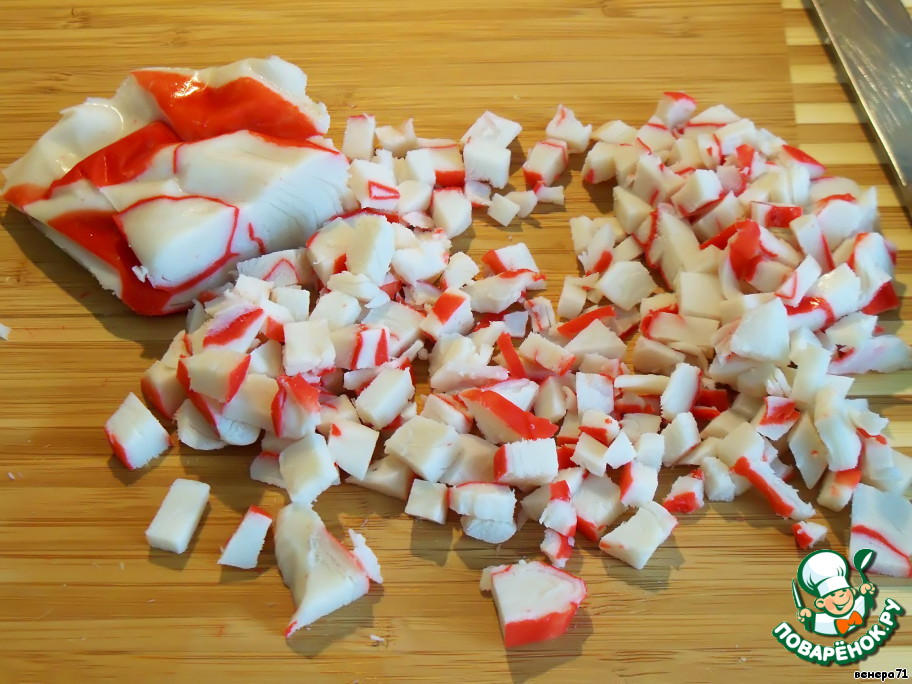 Крабовое мясо мелко порезать.