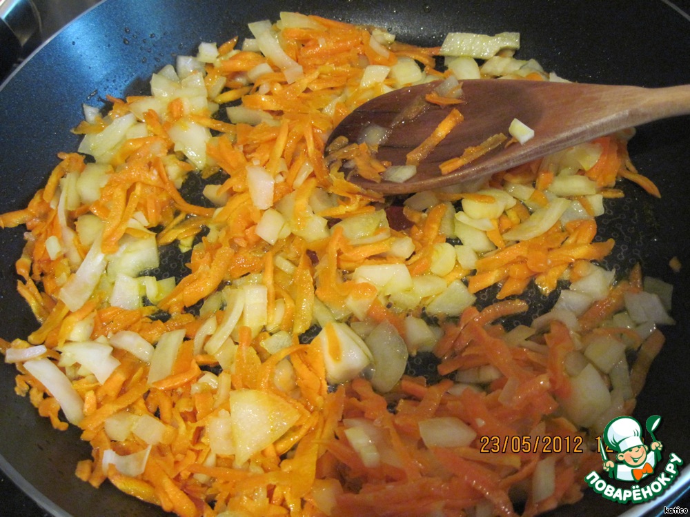 Чеснок мелко порубить, обжарить на растительном масле с натертой морковью, добавить порезанный кубиком лук.