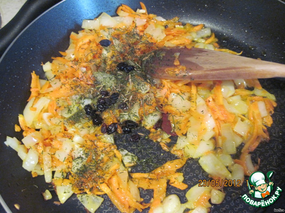 Когда лук станет полупрозрачным, добавляем специи, у меня зира, сушеный барбарис, черный перец и сушеная зелень укропа и петрушки.