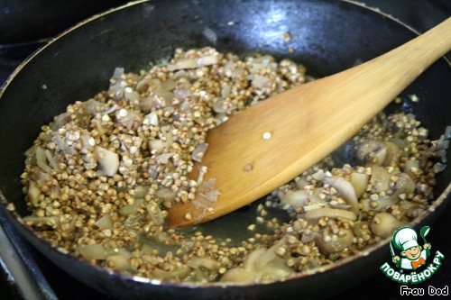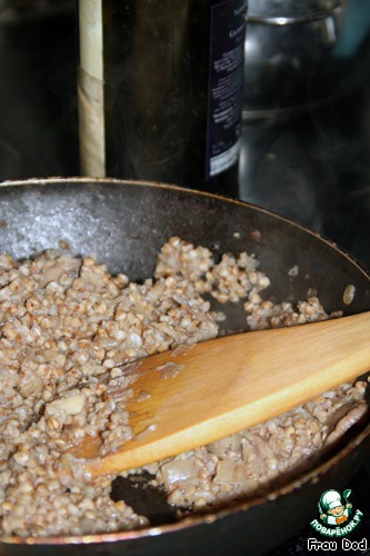 Убавить до минимума огонь, 2-3 минуты прогреть гречку на сковороде, после чего вливать бульон маленькими порциями. По мере впитывания жидкости, вливать еще. Постоянно помешивать.