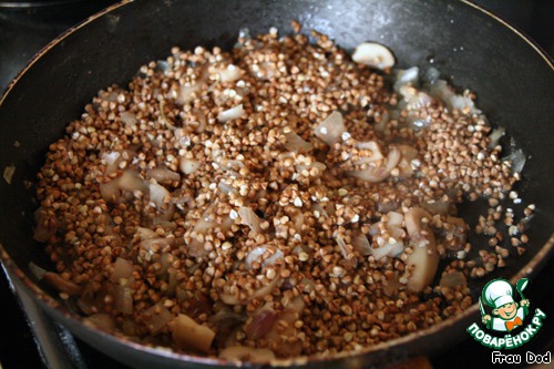 Лук и чеснок нарезать. Обжарить в смеси сливочного и оливкового масла до прозрачности. Добавить грибы, посолить, поперчить. Через 2 минуты всыпать гречку.