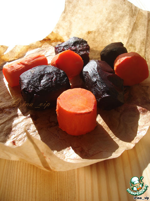 Запечём свеклу и морковь. Для этого корнеплоды необходимо хорошенько вымыть, обсушить, завернуть в фольгу либо поместить в жаропрочную посуду и запекать в духовом шкафу при температуре 175*C, 50-60 минут. Овощи для этих целей можно и отварить.