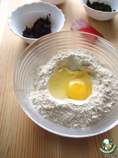 В миску просеять муку с солью. В углубление в центре муки вылить слегка взбитое вилкой яйцо, замесить тесто, разделить его на три части. В каждую часть вмешать по 2 ч.л. пюре свеклы и моркови и укропный краситель. Замесить эластичное тесто, как для пельменей, по необходимости подсыпая муку. У меня такая необходимость возникла.