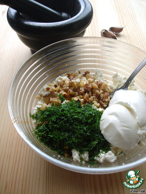 я раскрошила его вилкой, но любой творог здесь будет уместен. Добавить мелко нарезанный укроп, порубленные, не очень крупно, грецкие орехи, выдавить чеснок (у меня был один зубчик, но большой), посолить по вкусу. Добавить йогурт или сметану, две-три столовых ложки, до получения пастообразной, но не жидкой, консистенции.