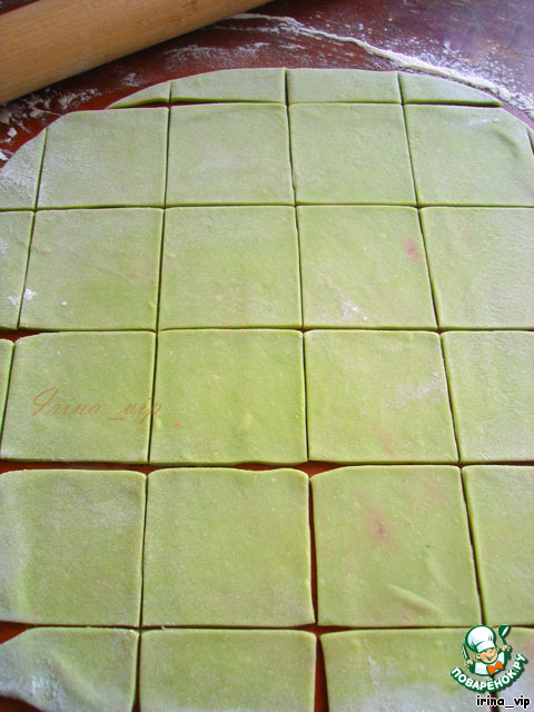 На присыпанной мукой поверхности достаточно тонко раскатать, в квадрат, один из трёх разноцветных кусочков теста. Нарезать на квадраты со стороной 5 см. Тут очень пригодится нож для пиццы. Но я резала обыкновенным – справилась.