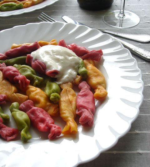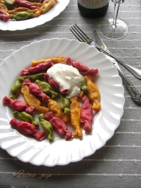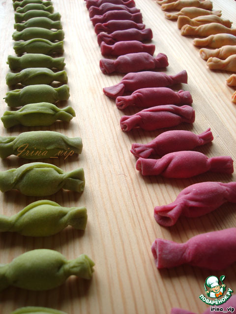 | Яркие «конфетки» из пельменного теста с начинкой из творога или домашнего сыра с зеленью, орехами и чесноком – веселая альтернатива традиционным вареникам. Источник: журнал «Школа гастронома» № 8 /2011. |