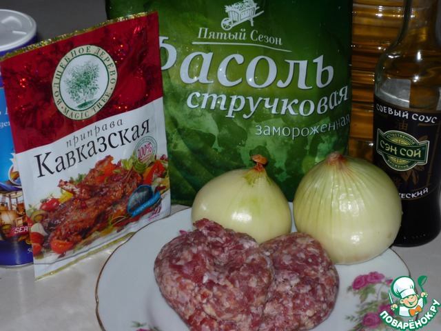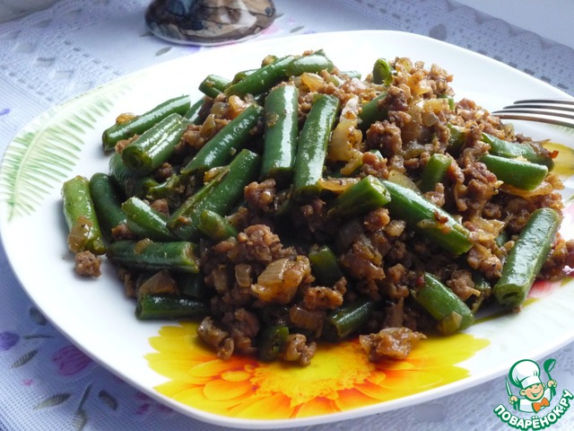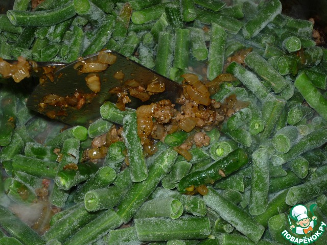 Добавляем замороженную стручковую фасоль, закрываем крышкой, убавляем огонь на минимум и тушим до готовности фасоли, периодически помешивая. Пробуем на соль, при необходимости досаливаем.