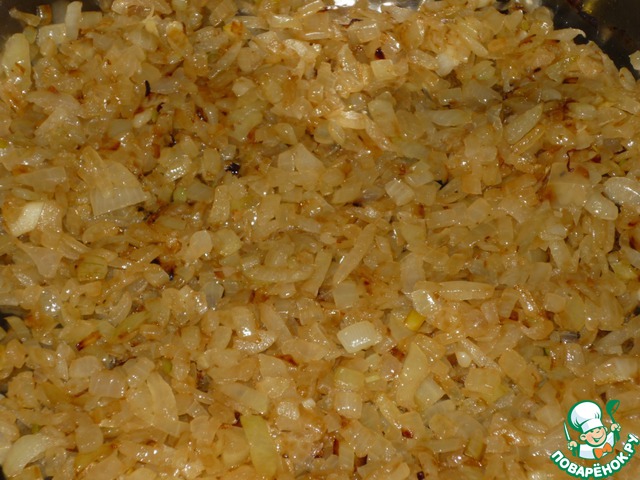Лук мелко режем и обжариваем на сковороде до золотистого цвета.