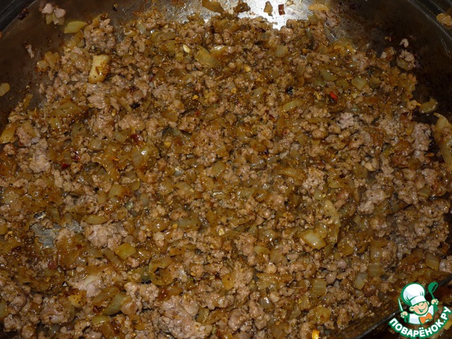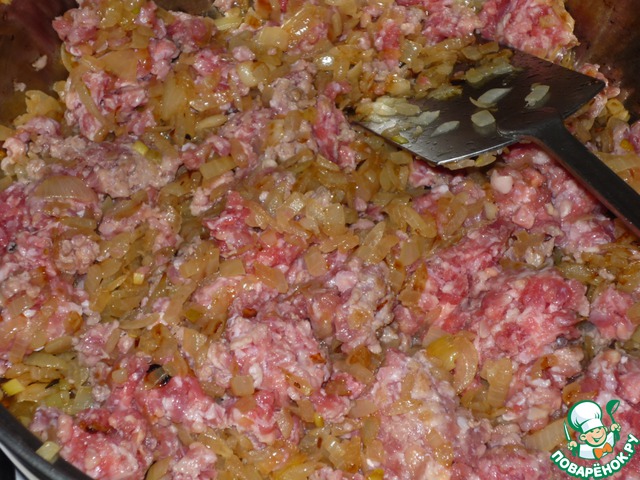 Добавляем фарш и, постоянно помешивая, обжариваем на большом огне минут 5.