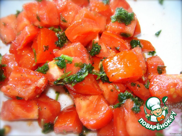 Теперь по-быстрому приготовим что-то похожее на сальса. Для этого помидоры режем кубиками (можно очистить от кожицы), добавляем рубленную зелень, перец, соль, кумин, чуточку чеснока (в гранулах или свежего) и поливаем лимонным (или лаймовым) соком. Для сальсы еще используется красный лук и чили, но я посчитала, что для завтрака это будет уже островато.