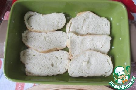 Форму для запекания смазать растительным маслом, ломтики хлеба слегка отжать и уложить слоем в форму.