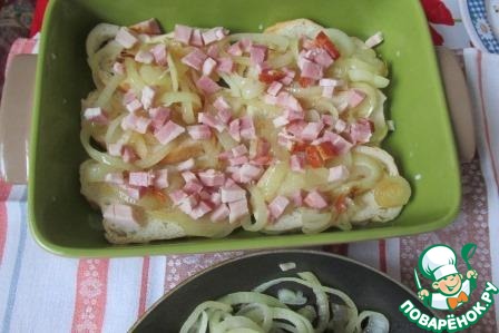 На хлеб выложить половину жареного лука, затем кубики окорока и остальной лук.