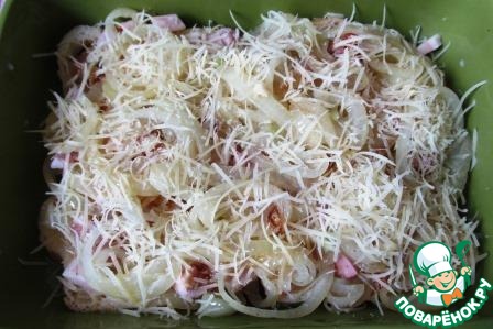 Окорок (или ветчину, грудинку, бекон, колбасу) нарезать мелким кубиком, сыр натереть на мелкой терке.