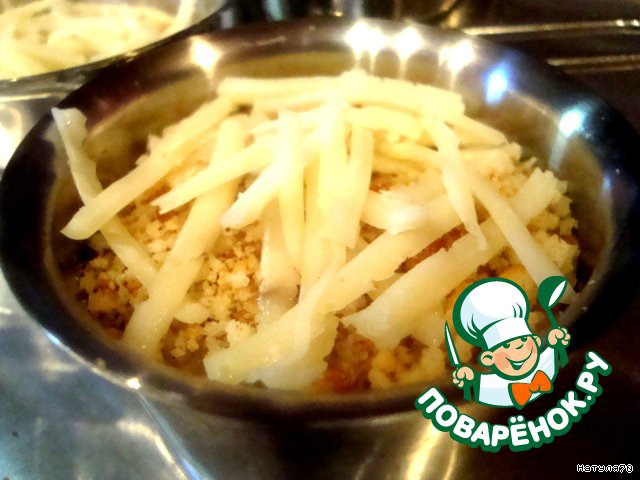 Кокотницы смазываем маслом, присыпаем панировочными сухарями, выкладываем будущий жюльен. Сверху присыпаем сухарями и сыром. Ставим в духовку запекаться до золотистой корочки.