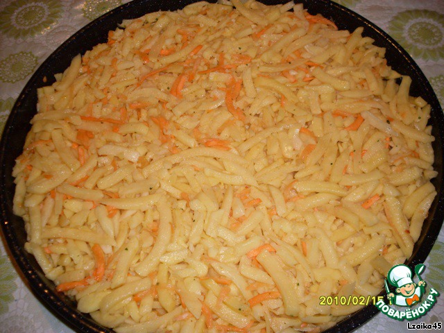 Нарезанную соломкой картошку перемешать с натертой на терке морковью. Посолить, поперчить и выложить ровным слоем на мясо.