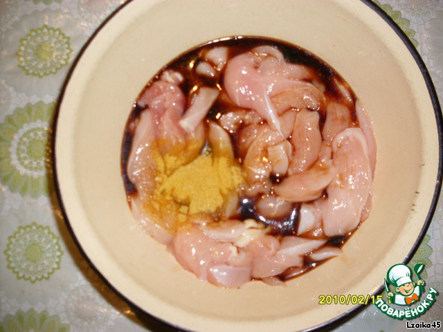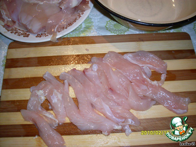 Куриное филе нарезать длинными тоненькими полосками.