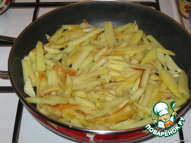 Картошку нарезать соломкой и обжарить почти до готовности. Печень перемолоть через мясорубку, добавить лук, соль, специи и пару ложек муки. Залить этой смесью картошку и жарить до готовности. Затем смешать яйца, молоко и зелень (посолить по вкусу) и жарить до готовности омлета. Один НЮАНС: если сковорода небольшая, как это было у меня, и печени много, то после того, как картошка зажарилась и покрыта печенью, все это дело лучше отправить в духовку до полного пропекания печенки. Потом залить яйца с молоком и опять поставить в духовку.