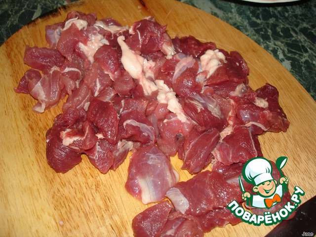 Мясо порезать на маленькие кусочки.