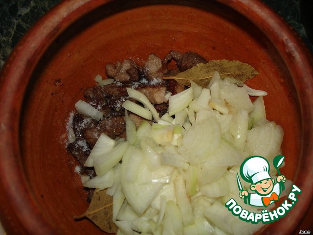 Собираем горшок: на дно положить жареное мясо, лавровый лист, перец, посолить.