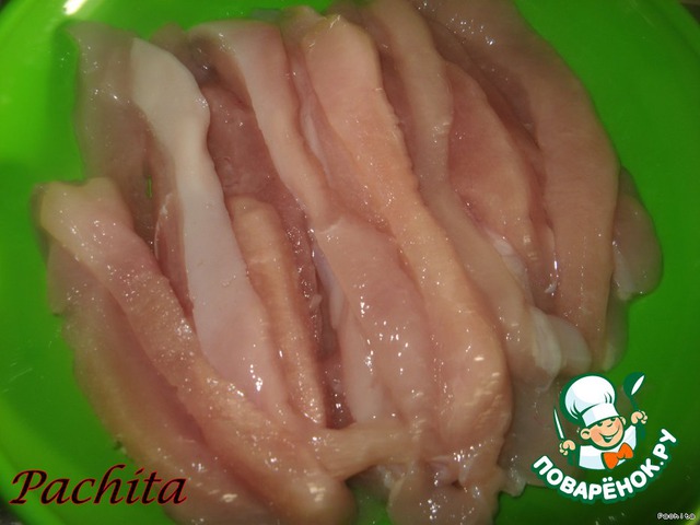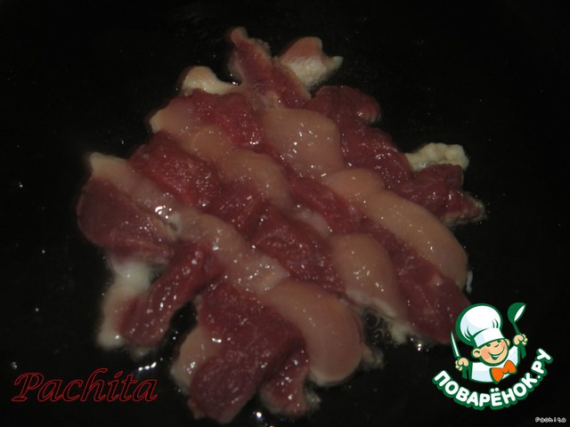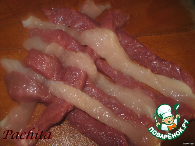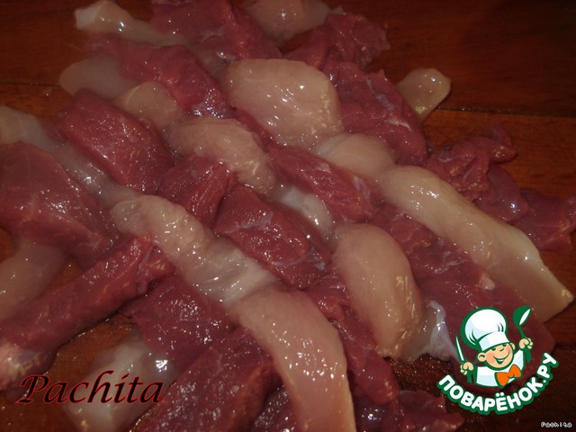 Мясо говядины обмыть, нарезать длинными полосками шириной в 1 см.