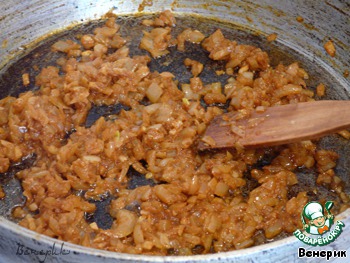 Луковицу и чеснок мелко нарезать и обжарить на растительном масле до золотистого цвета.