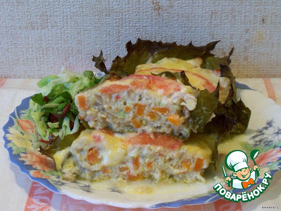 Сверху листик немного подсох, но внутри он стал мягкий, пропитан сметанным соусом, отдав свою нежную кислинку овощам.
