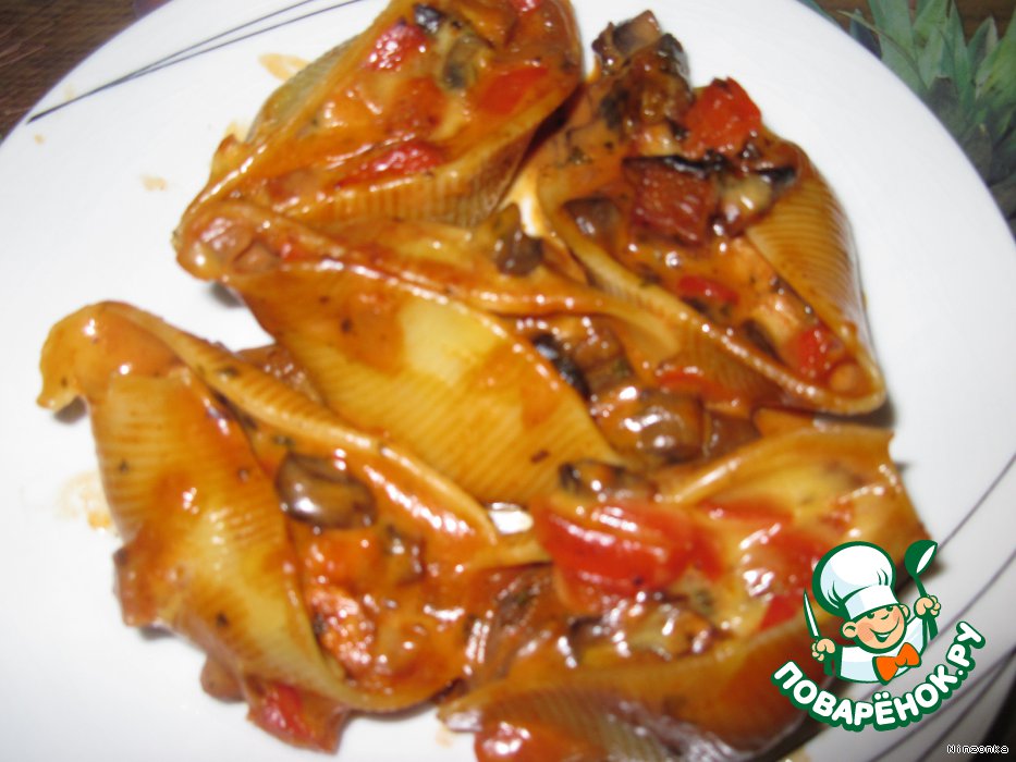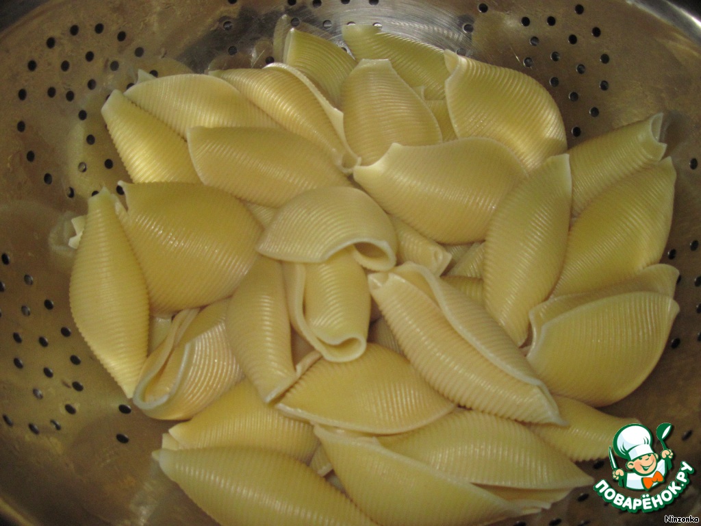 Макароны-ракушки отвариваем в подсоленной воде до полуготовности. Откидываем на дуршлаг и даем остынуть. Тем временем готовим начинку.