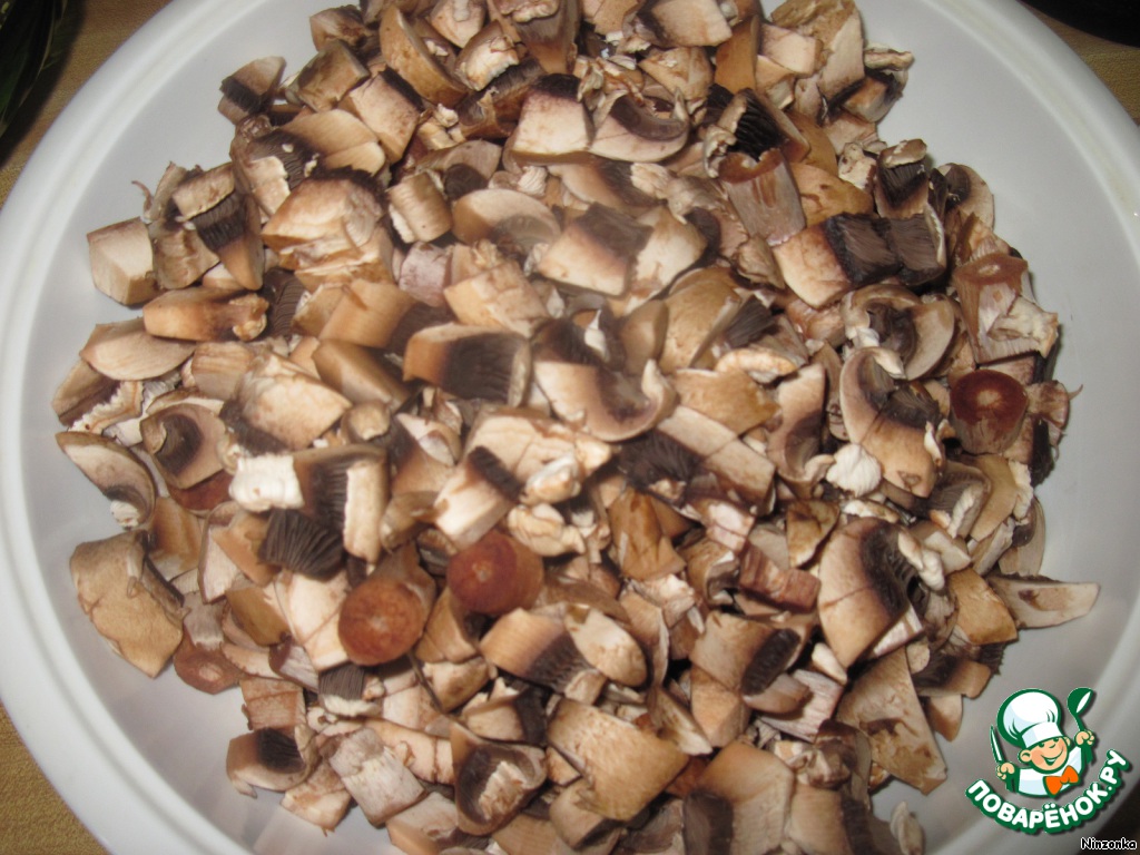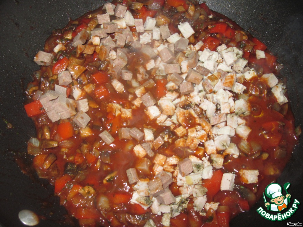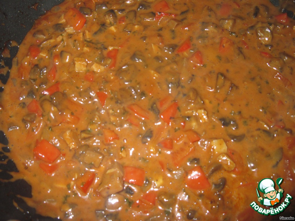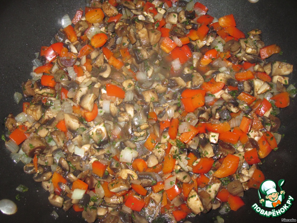 На разогретую сковороду кладем лук, грибы и красный перец. Тушим с закрытой крышкой минут 5. Затем добавляем петрушку (у меня была сухая, но можно и свежую), мускатный орех, томатную пасту, соль и перец. Тушим еще, пока часть влаги не испарится.