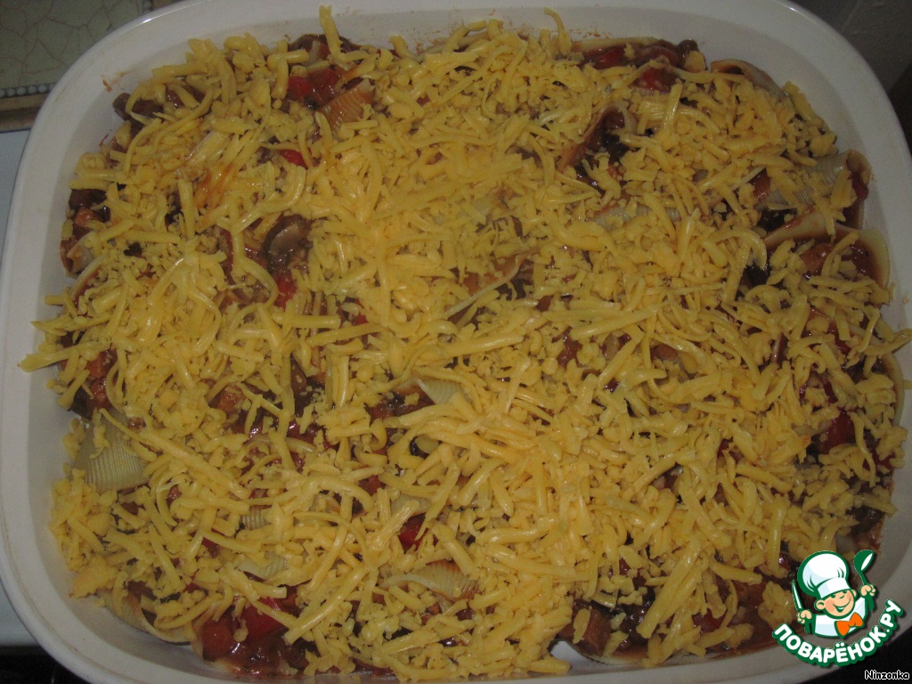 В форму для запекания кладем нафаршированные ракушки. Сверху посыпаем тертым сыром и отправляем в духовку минут на 15-20.