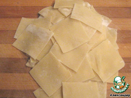 Из муки, воды, яиц и соли замешиваем тесто, как на вареники. Даем 30 минут отдохнуть. По кусочку отрезаем и очень тонко раскатываем. Даем ему хорошо подсохнуть.
