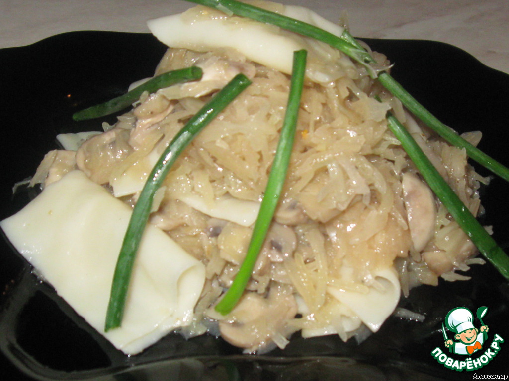 Пока тесто сохнет, мелко шинкуем капусту и тушим ее с грибами и луком. Солим и перчим.