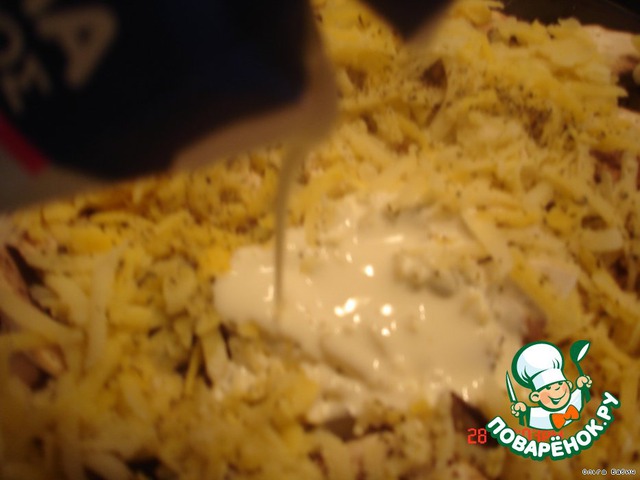 Последний слой - картофель, натертый на терке, присыпать и полить сливками.