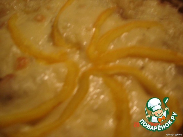 Накрыть крышкой и поставить в духовку на 30 минут, открыть крышку, присыпать сыром и перцем болгарским, запекать еще минут 10.