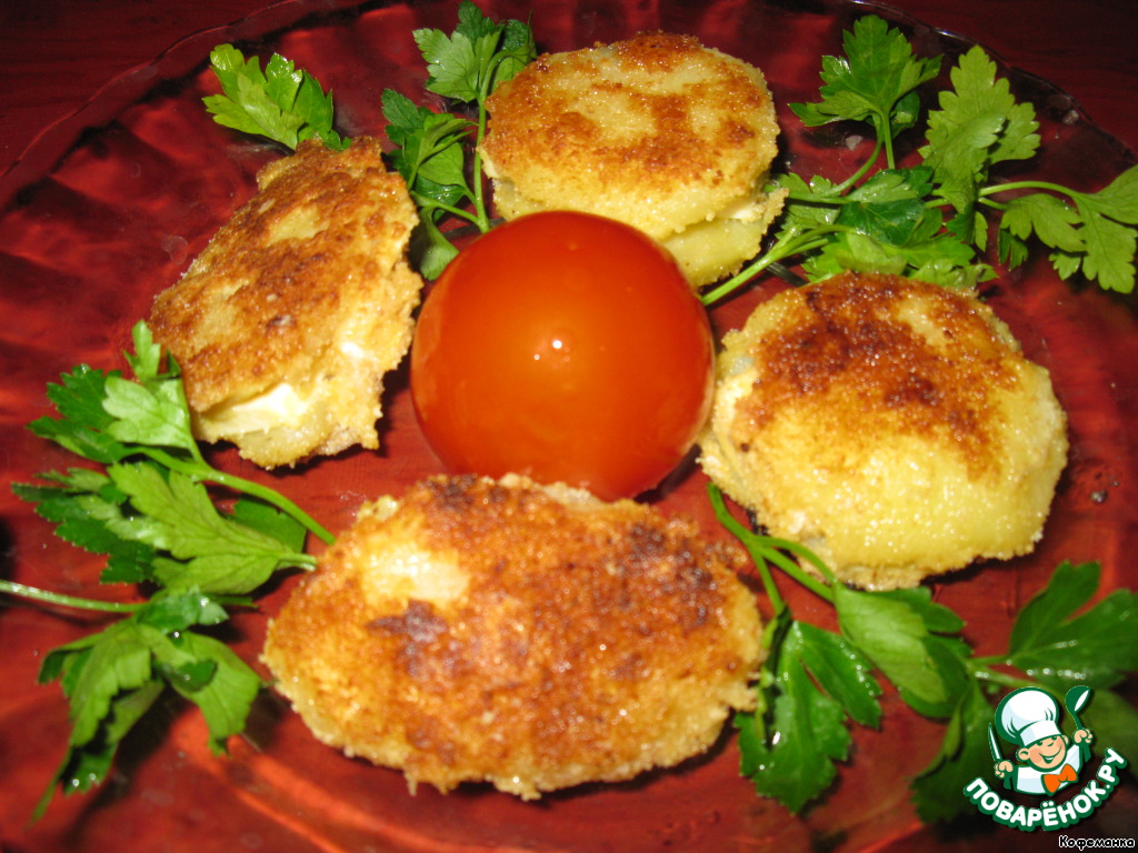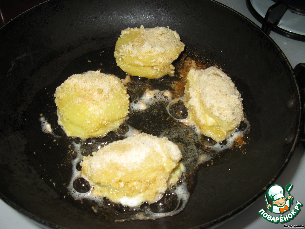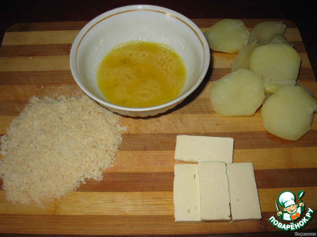 Теперь формируем "сандвичи". На кусочек картошки кладем пластиночку сыра и сверху накрываем картошечкой. Теперь обмакиваем в яйце, обваливаем в сухарях и ... на сковородочку! Кто-то говорил, что лучше обваливать в натертом на терке слегка черством хлебе. Но такого хлеба у меня не оказалось...
